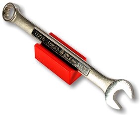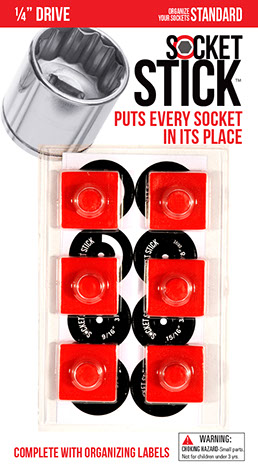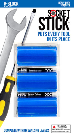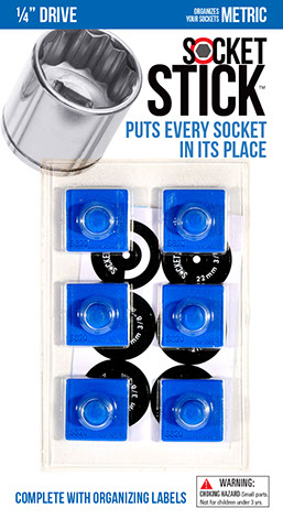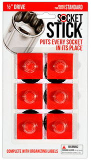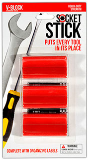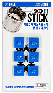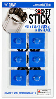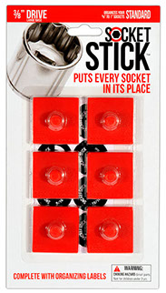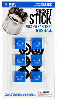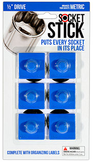 It is the newest thing in the world of tools. You use it to organize your sockets so you know where to find them, where to return them and most importantly, when they are missing. It comes in the 3 most common sizes for socket drives – 1/4”, 3/8” and 1/2". It comes with labels so you can identify which socket belongs on which SocketStick. Underneath, it has a rare earth, nyodium magnet which holds the Socket to the SocketStick and the SocketStick to any steel surface like a drawer in your toolbox or the inside of a metal cabinet door. It also comes in Red for Standard sockets and Blue for Metric sockets.