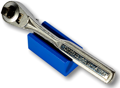 The V-Block is also new in the world of tools. You use it to organize and keep track of wrenches, socket drives, screwdrivers and other elongated tools. Like the SocketStick, there are labels so you can identify which tool is held by which V-Block. Underneath, it has a rare earth, nyodium magnets as well, holding the tool to the V-Block and the V-Block to any steel surface in a toolbox, cabinet or workbench.